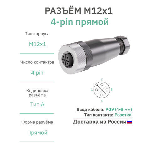 Разъём М12 4 pin прямой / розетка (мама) / PG9 (4-8 мм диаметр под кабель) / модель RAZM-F12-C4-PG9