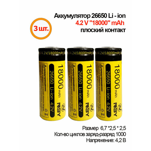 3шт. Аккумуляторная батарея Li-ion 26650,18000mAh, 4.2V, плоский контакт