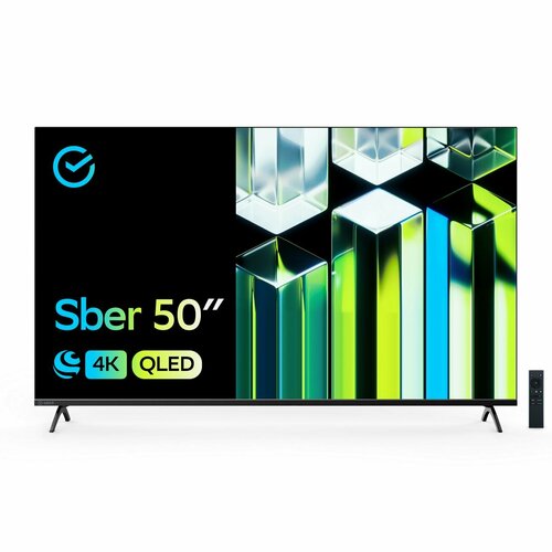 черныйУмный телевизор Sber UHD 50″, чёрный Умный 4K-телевизор Sber с ярким экраном диагональю 50″. Минималистичный дизайн, высокая скорость работы и прекрасное качество звуки и изображения порадуют самых требовательных зрителей. Качественный звук Динамики закрытого типа создают объёмный и чистый звук. Благодаря предустановленным настройкам эквалайзера фильмы, концерты и спортивные трансляции звучат сбалансированно и ярко. Большой объём оперативной и постоянной памяти 2 Гб оперативной памяти ускоряют работу девайса. 8 Гб постоянной памяти хватит для установки любых необходимых вам приложений. Российская платформа Салют ТВ Все данные хранятся на отечественных серверах, что даёт высокую надёжность и безопасность. В ОС Салют ТВ используются сервисы, разработанные Sber