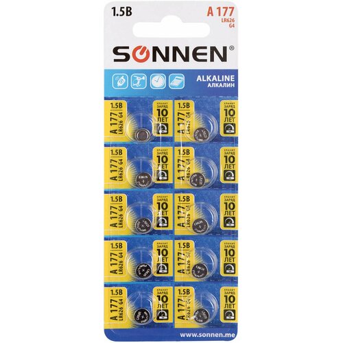 Батарейки алкалиновые таблетка Комплект 10 штук, Sonnen Alkaline 177A (G4, Lr66), блистер 880789