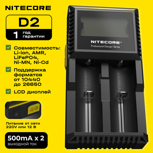 Зарядное устройство NITECORE D2 18650 / 16340 на 2*АКБ, зарядка для аккумуляторных батареек, зарядник Найткор
