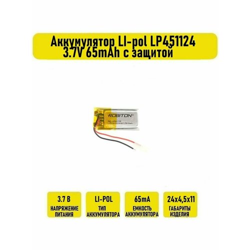 Аккумулятор LI-pol LP451124 3.7V 65mAh с защитой