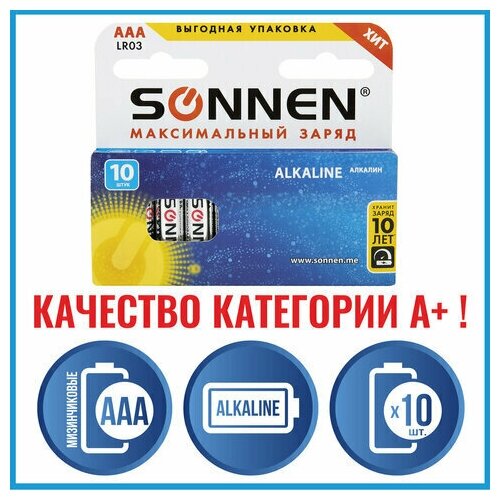 Батарейки комплект 10 шт, комплект 30 шт, SONNEN Alkaline, AAA (LR03, 24А), алкалиновые, мизинчиковые, в коробке, 451089