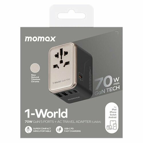 Зарядное устройство сетевое, универсальное Momax UA8AE 1-World 70W GaN, 2xType-C + 2xUSB-A + PD - (Titanium Chroma)