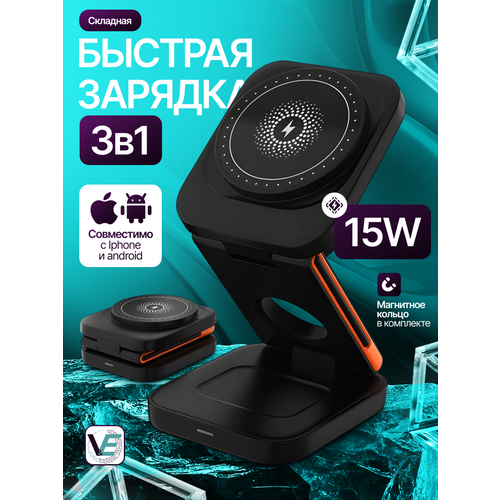 Беспроводное зарядное устройство 3 в 1 A07, 15 W, поддержка MagSafe, складная, чёрная 600016146272