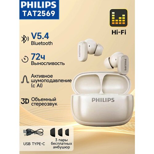 PHILIPS TAT2569 Полувключаемая Bluetooth-гарнитура, звук Hi-Fi, Активное шумоподавление (с AI), 72 часа работы от аккумулятора, 3 пары бесплатных антимикробных амбушюр, рис. реакционер