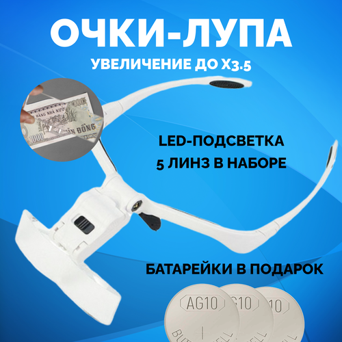 Очки лупа бинокулярная с подсветкой налобная для рукоделия, косметологов, работы с мелкими деталями 5 линз