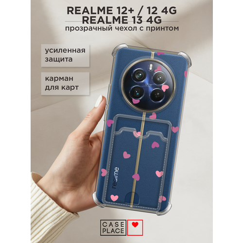 Чехол на Realme 12+/12 4G/13 4G (Реалми 12 Плюс/12 4G/13 4G) с картой и принтом Фиолетовые и розовые сердечки