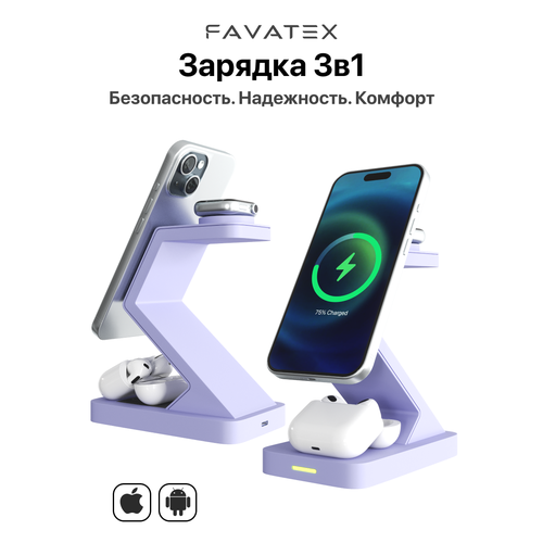 Магнитная беспроводная зарядка для iPhone 3 в 1 фиолетовая, док станция для Айфон, AirPods, Apple Watch