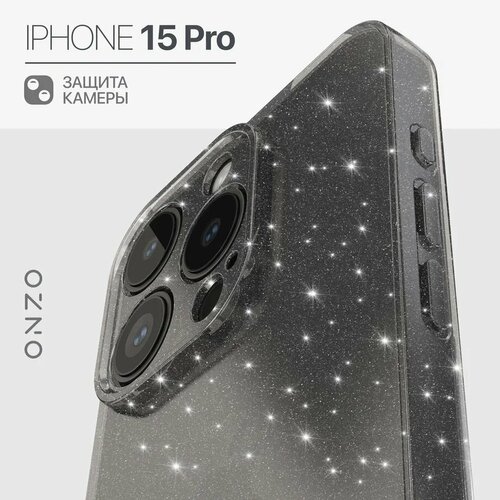 Чехол на iPhone 15 Pro / Айфон 15 Про тонкий, темно-прозрачный с серебристыми блестками