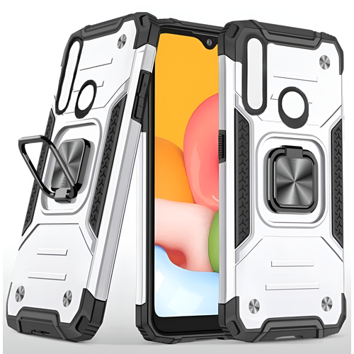 Противоударный чехол для Samsung Galaxy А30, A20, M10s серебро с пластиной и кольцом подставкой