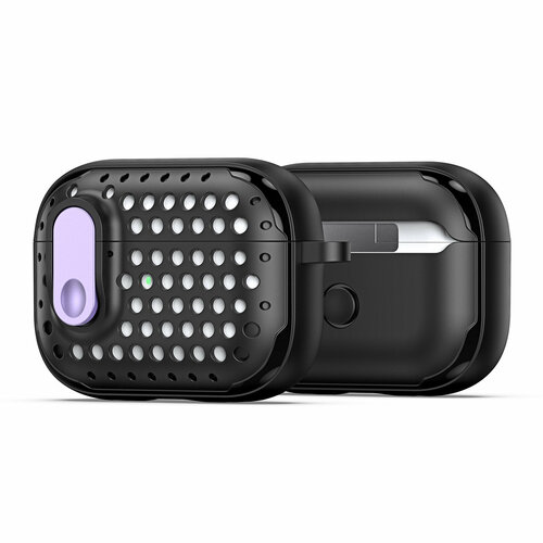 Усиленный чехол черного цвета с фиолетовой кнопкой от Dux Ducis для наушников Airpods Pro 2, серия PECM Series Case, в комплекте с карабином