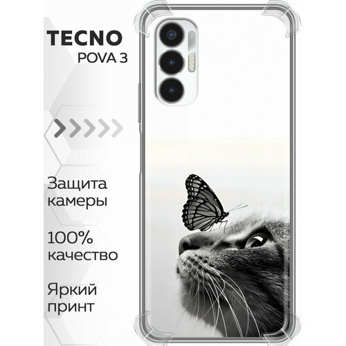 Чехол для Tecno Pova 3 с принтом кот и бабочка (Техно Пова 3)