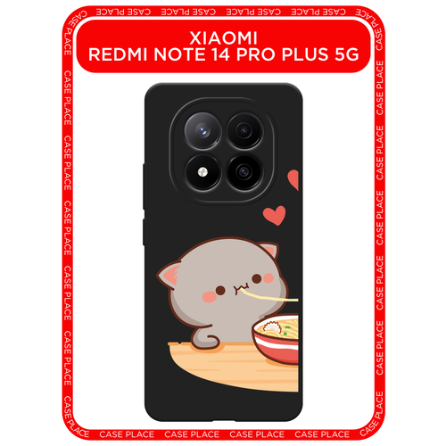 Черный матовый чехол на Xiaomi Redmi Note 14 Pro+ 5G / Сяоми Редми Нот 14 Про+ 5G с принтом Чёрный котик с лапшой
