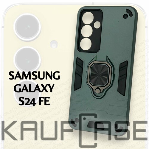 Противоударный чехол на Samsung S24 FE (6.65"), темно-зеленый. Кольцо-держатель и магнитное крепление, яркие пластиковые защитные вставки