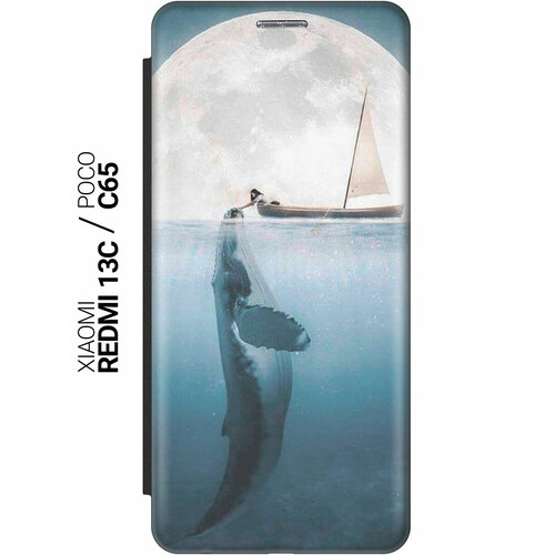 Чехол-книжка на Xiaomi Redmi 13C / Poco C65 / Сяоми Редми 13С / Поко С65 с рисунком "Кит и лодка" черный
