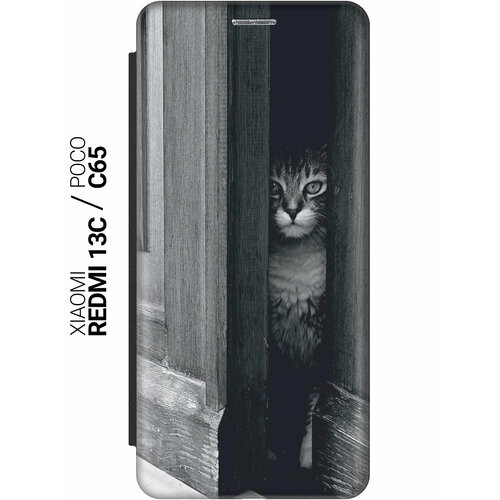 Чехол-книжка на Xiaomi Redmi 13C / Poco C65 / Сяоми Редми 13С / Поко С65 с рисунком "Выглядывающий кот" черный