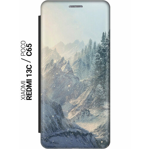 Чехол-книжка на Xiaomi Redmi 13C / Poco C65 / Сяоми Редми 13С / Поко С65 с рисунком "Снежные горы и лес" черный