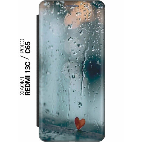 Чехол-книжка на Xiaomi Redmi 13C / Poco C65 / Сяоми Редми 13С / Поко С65 с рисунком "Сердечко на фоне дождя" черный