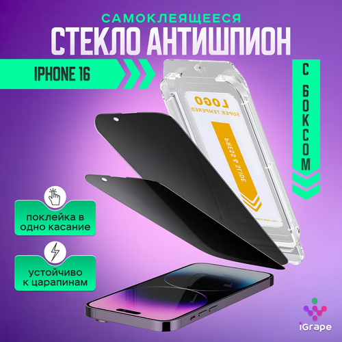 Защитное стекло самоклеящееся с боксом iPhone 16, iGrape (Антишпион) / стекло на айфон 16