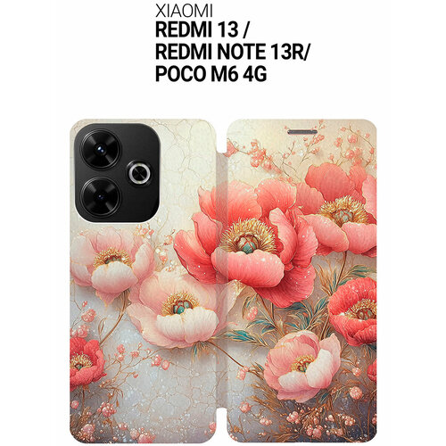 Чехол-книжка на Xiaomi Redmi 13 / Redmi Note 13R / Poco M6 4g с принтом "Винтажные маки" золотой