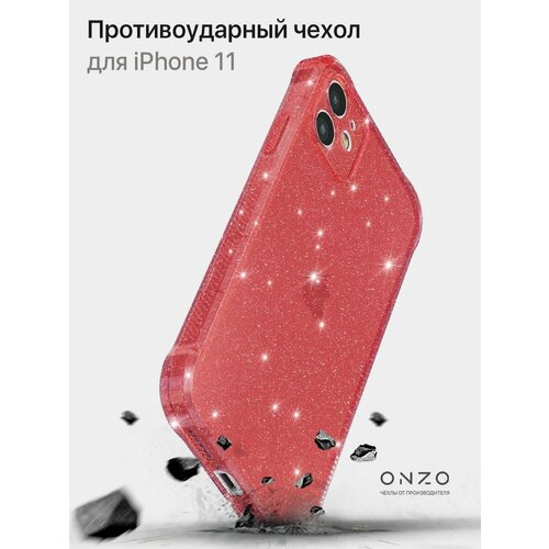 Чехол на Айфон 11 противоударный прозрачный красный с блестками iPhone 11 чехол