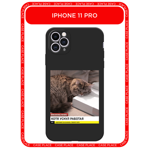 Черный матовый чехол на Apple iPhone 11 Pro / Айфон 11 Про с принтом Кот уснул работая