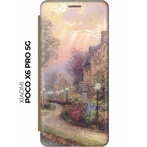 Чехол-книжка на Xiaomi Poco X6 Pro 5G / Сяоми Поко Х6 Про 5г с рисунком "Сиреневый вечер" золотой