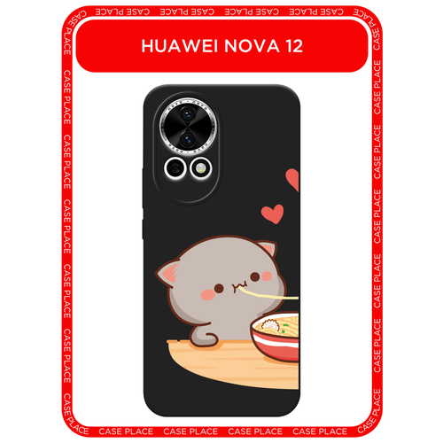 Черный матовый чехол на Huawei Nova 12/Nova13 / Хуавей Нова 12/Нова 13 с принтом Чёрный котик с лапшой