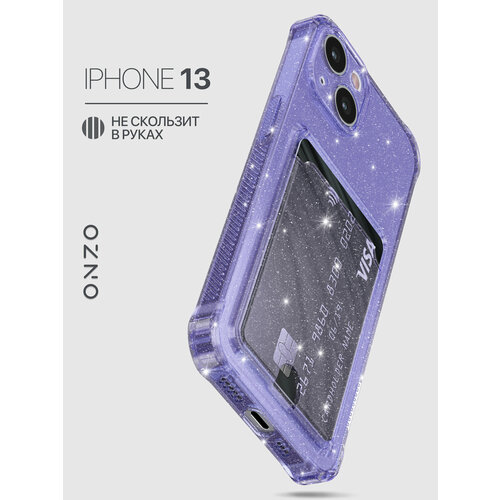 Чехол на Айфон 13 противоударный с карманом для карт прозрачный фиолет Very Peri с блестками iPhone 13 чехол