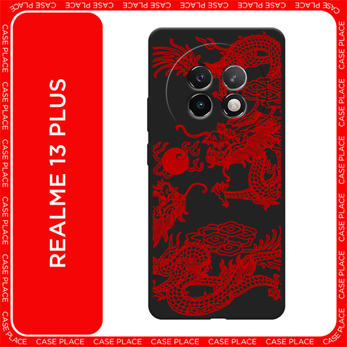 Черный матовый чехол на Realme 13+ / Реалми 13+ с принтом Красный азиатский дракон