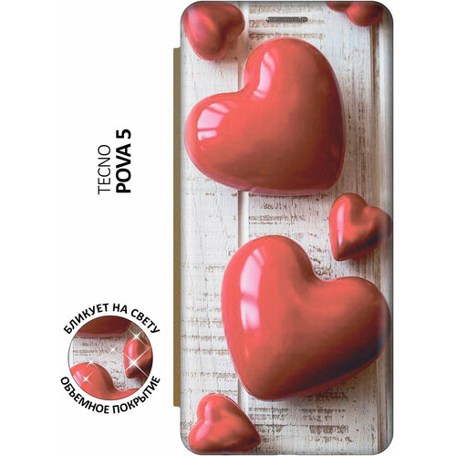 Чехол-книжка Сердечки на белом столе на Tecno Pova 5 / Техно пова 5 с эффектом блика золотой