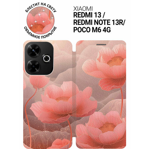 Чехол-книжка на Xiaomi Redmi 13 / Redmi Note 13R / Poco M6 4g с принтом "Магические цветы" золотой