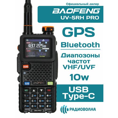 Рация Baofeng UV-5RH PRO Bluetooth 10W GPS большой цветной дисплей зарядка от USB Type-C