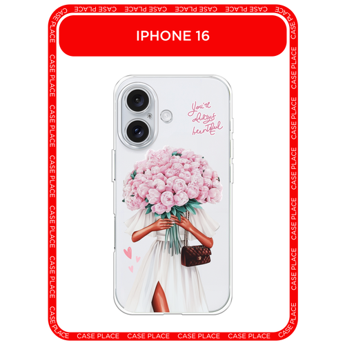 Чехол на Apple iPhone 16 / Айфон 16 с принтом Девушка с букетом пионов, прозрачный