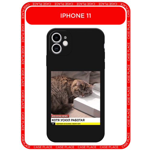 Черный матовый чехол на Apple iPhone 11 / Айфон 11 с принтом Кот уснул работая