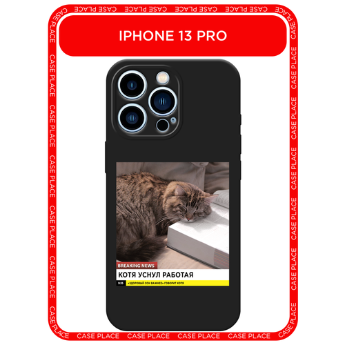 Черный матовый чехол на Apple iPhone 13 Pro / Айфон 13 Про с принтом Кот уснул работая