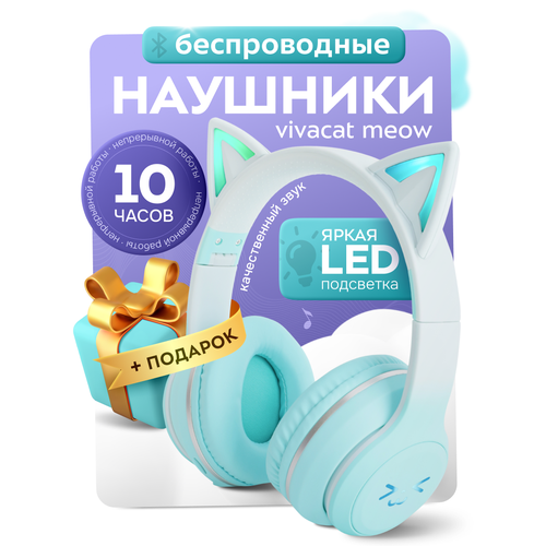 Наушники беспроводные детские Vivacat Meow, микрофон, AUX, слот для карты памяти, LED подсветка ушек, Bluetooth, голубые