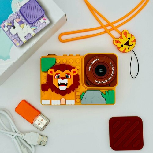 Детский цифровой фотоаппарат с селфи камерой и головоломкой для девочки, мальчика, игрушечная фотокамера для детей ударопрочная 1080p Full-HD, Львенок для ребенка