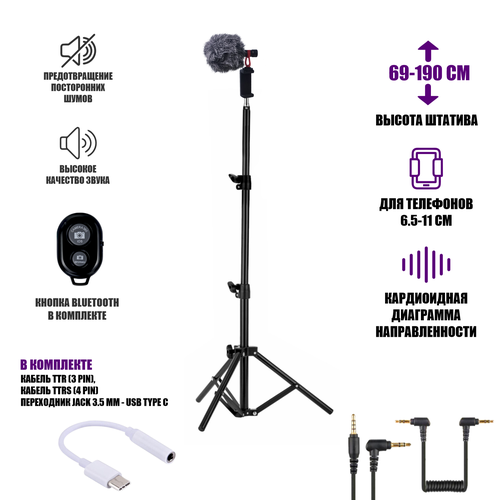 Микрофон пушка BY-MM1 с ветрозащитой и переходником Jack 3.5 мм - USB Type-C на напольном штативе с держателем телефона и кнопкой Bluetooth