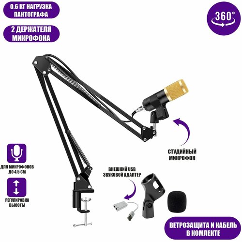 Конденсаторный микрофон BM-800 (в комплекте USB звуковой адаптер, пантограф, поп-фильтр, ветрозащита, паук и держатель для микрофона), черно-золотой