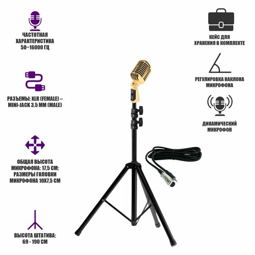 Микрофон винтажный золотой, кабель 3 м XLR (female) – mini-jack 3.5 mm (male), на напольной стойке JBH