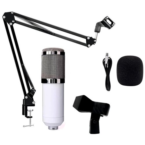 Конденсаторный микрофон BM800 белый с фантомным питанием PHP2 48V на настольной треноге с кабелями для подключения