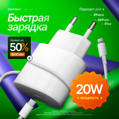 Быстрая зарядка для iphone и iPad, AirPods, SVMKT-78658, Блок питания Type C 20W + Кабель, Сетевое зарядное устройство.