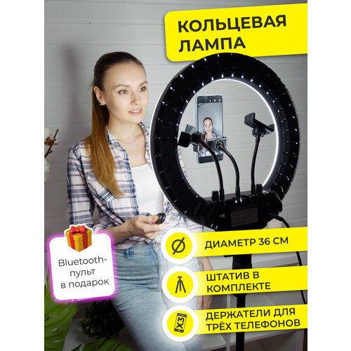 Профессиональная кольцевая светодиодная лампа LED диаметром 36 см с держателем для телефона напольным штативом и селфи пультом - для стилиста визажиста и селфи. Модель 123141
