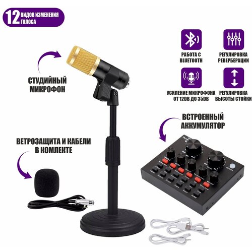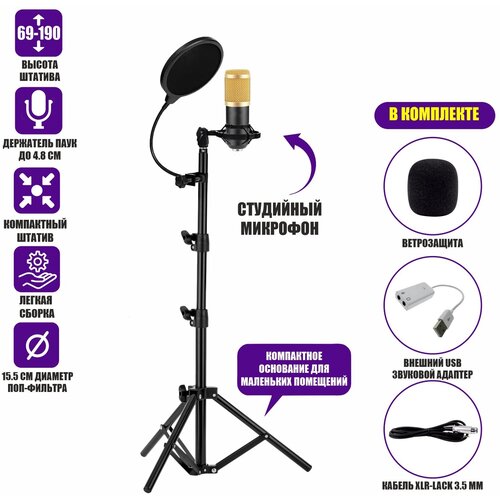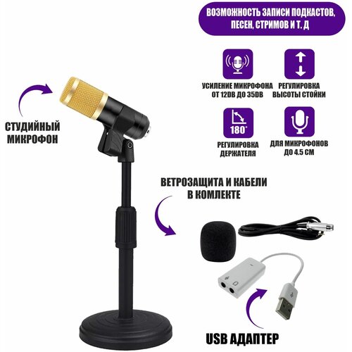 Конденсаторный микрофон на настольной подставке с регулировкой высоты и держателем прищепкой, с кабелем XLR - Jack 3.5 и USB адаптером, черно-золотой