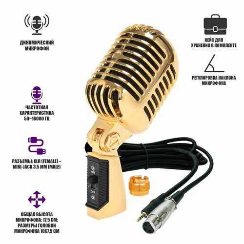 Микрофон винтажный золотой, кабель 3 м XLR (female) – mini-jack 3.5 mm (male), на пантографе ST с усиленной струбциной