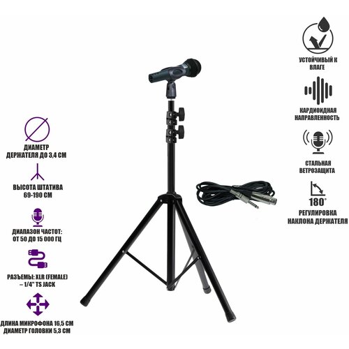 Микрофон динамический SH-02, кабель 4м XLR – Jack 6.35, на напольной стойке JBH с держателем для ручного микрофона