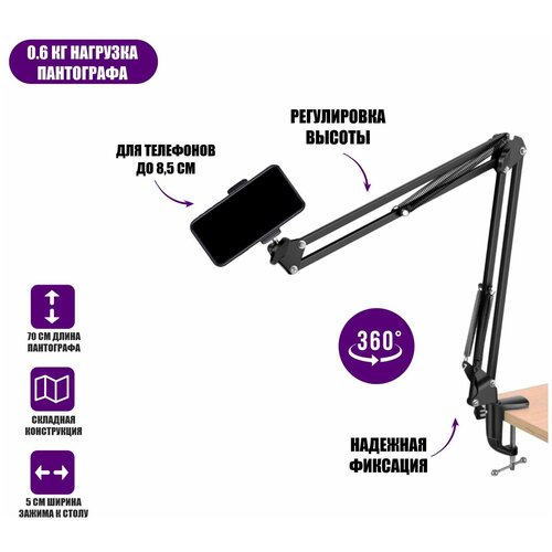черныйДержатель-прищепка для телефона шириной до 18 см служит для удобного и лаконичного размещения Вашего девайса на небольшом участке поверхности. Данная модель служит для крепления смартфона на стол, штатив, руль, компьютер, что добавит комфорта в видео и фото съемке. Вы можете вести блог, трансляцию, записывать тик ток, а Ваш телефон будет удобно размещён в нужном месте.