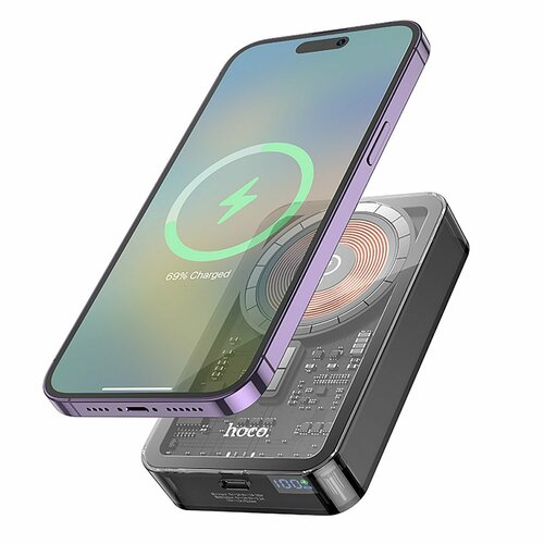 Магнитный аккумулятор с беспроводной зарядкой HOCO Q14A Ice Crystal, 10000 mAh, Qi 15W/PD 20W, Черный+Прозрачный